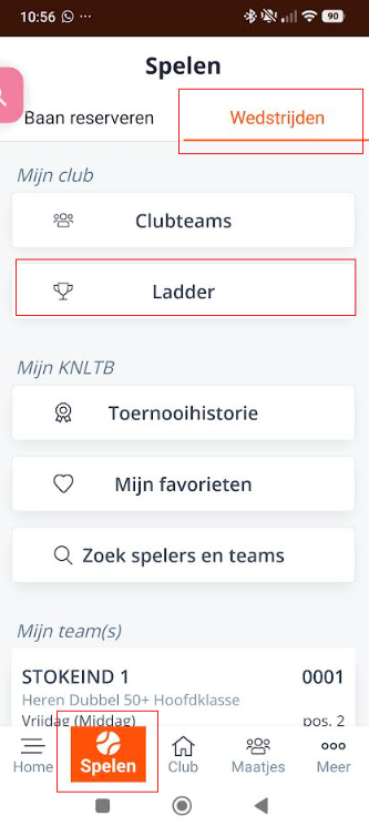 Hieronder uitleg hoe je bij de ladder komt. Kies in de knltb-app voor spelen, wedstrijden en ladder, zie afbeelding hieronder.